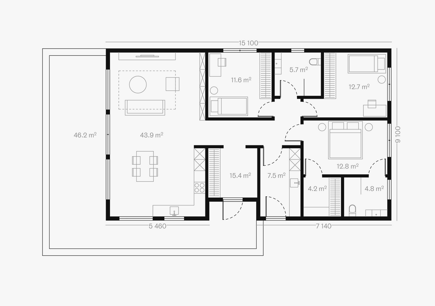 Ērta vienstāva ģimenes māja ar izteikti funkcionālu plānojumu – nav pārlieku liela, toties ļoti ietilpīga. Te ir viss, kas vajadzīgs komfortablai ikdienai, padomāts arī par saimniecības vajadzībām, ļaujot viegli uzturēt māju tīru un kārtīgu. Augstie griesti piešķir mājai plašumu, savukārt lielā L-veida terase ļauj baudīt sauli visas dienas garumā.