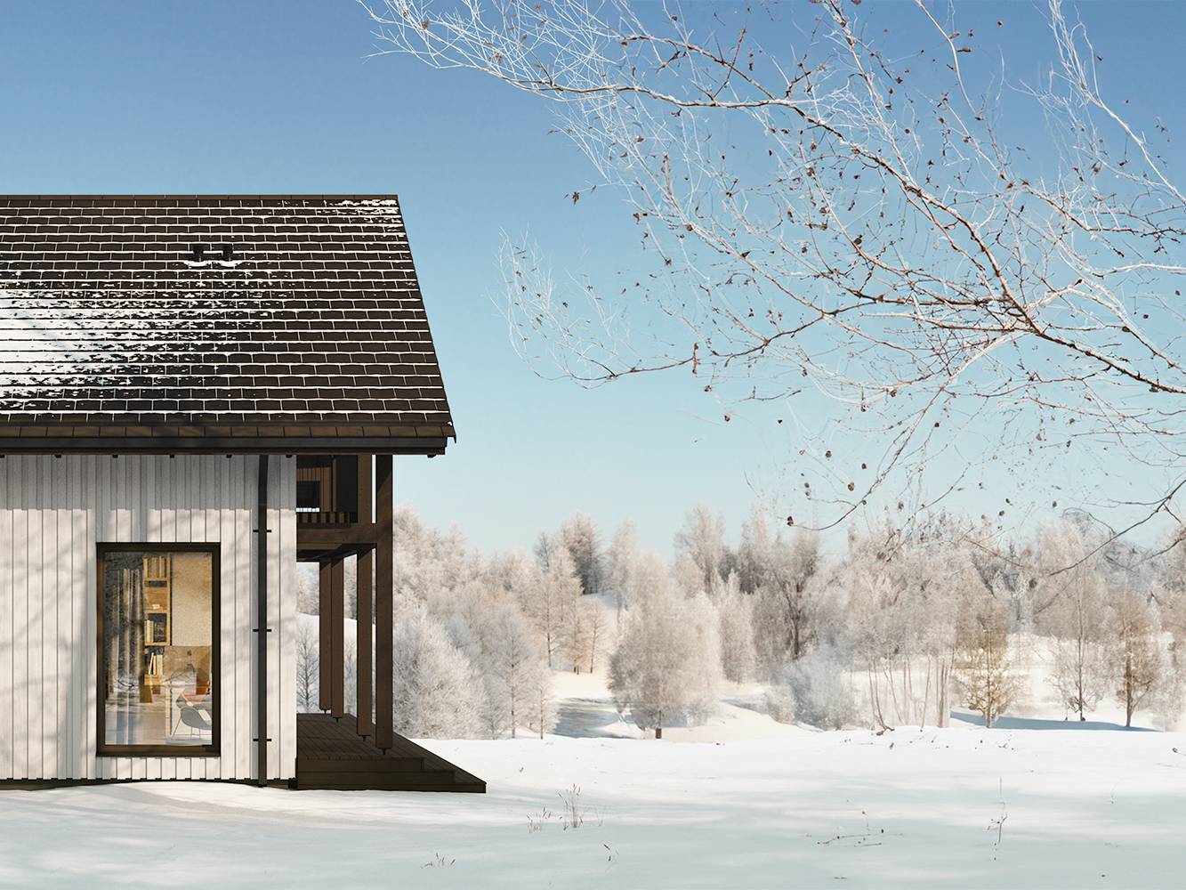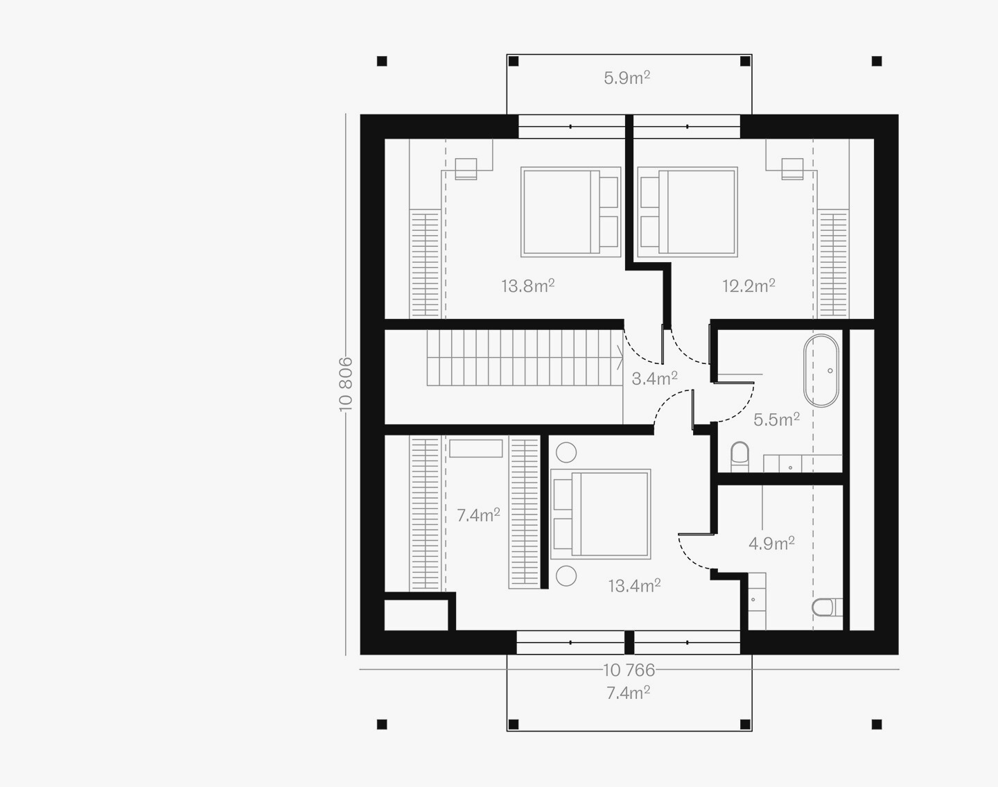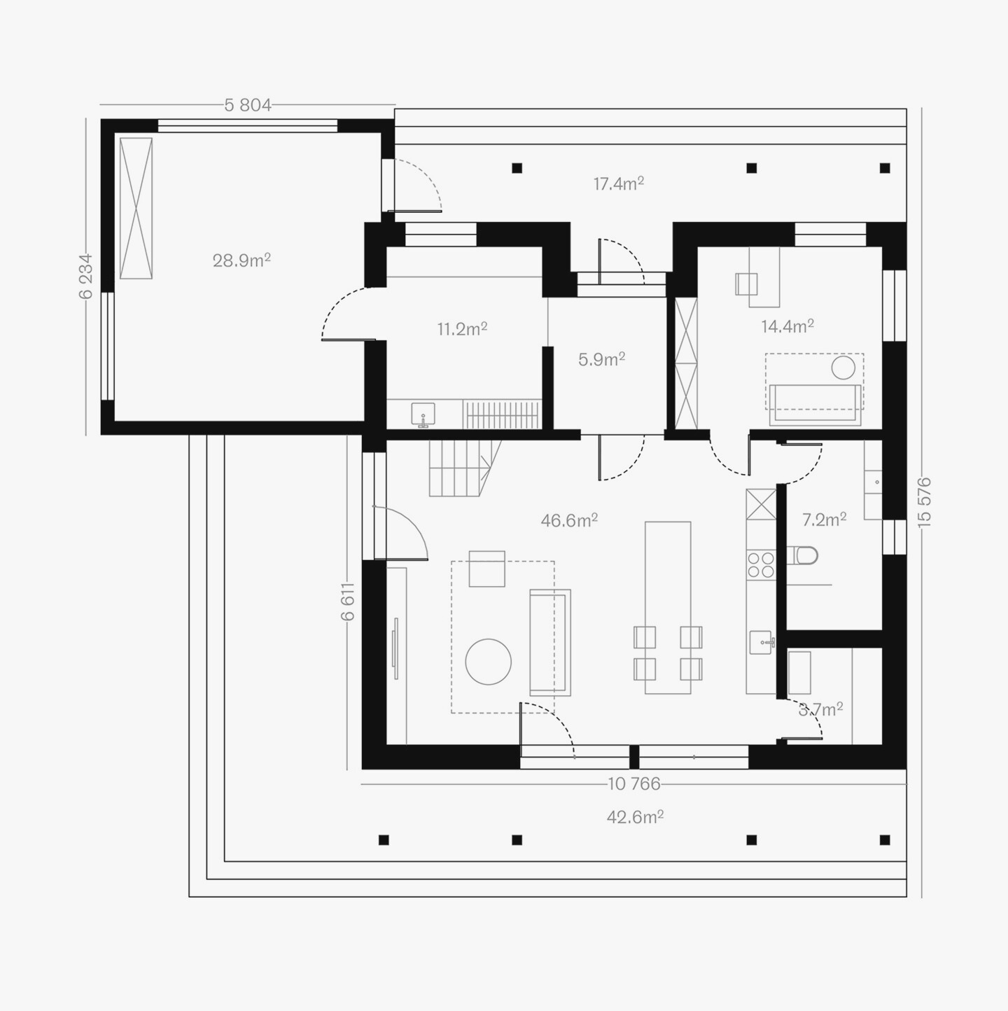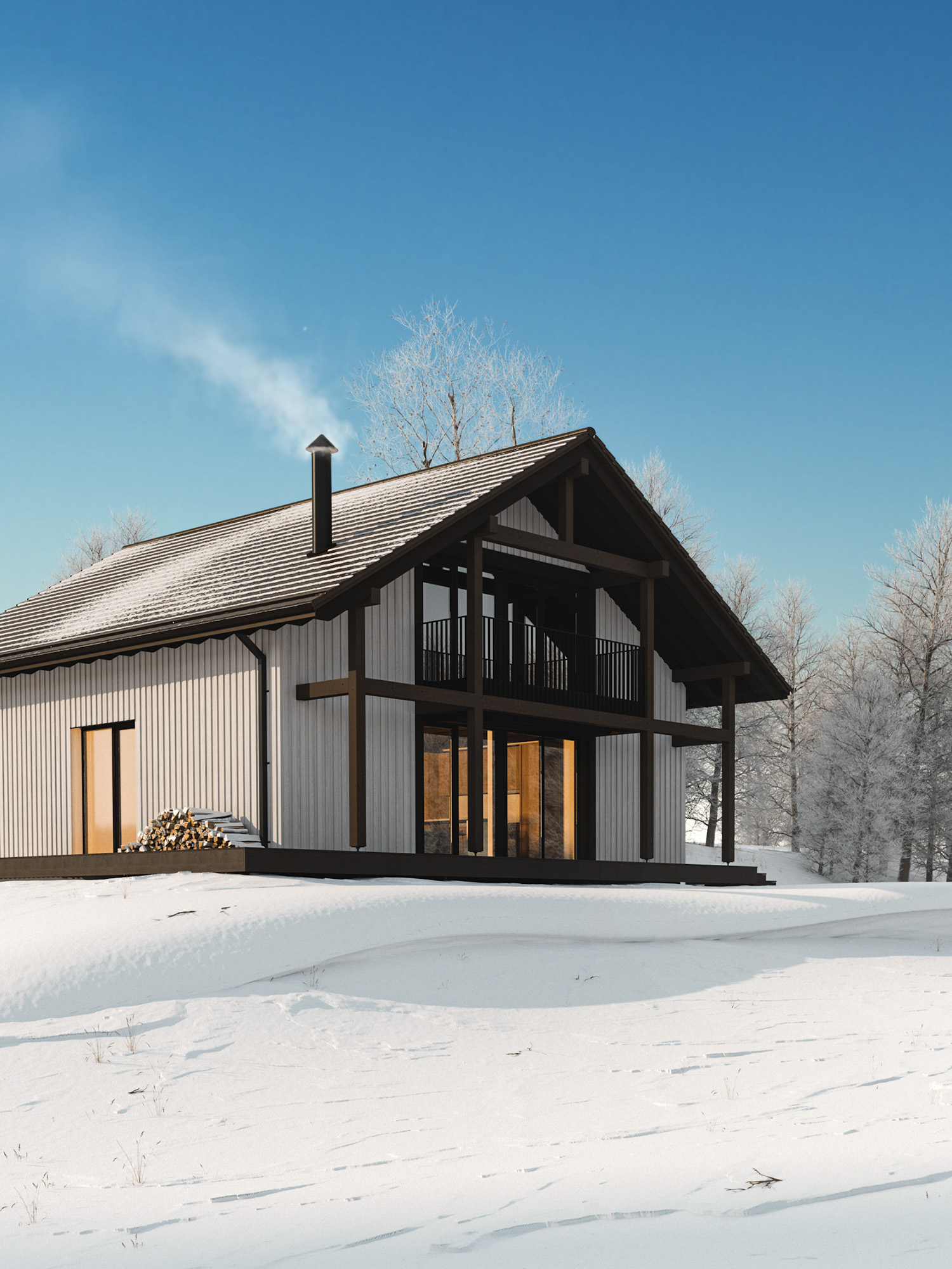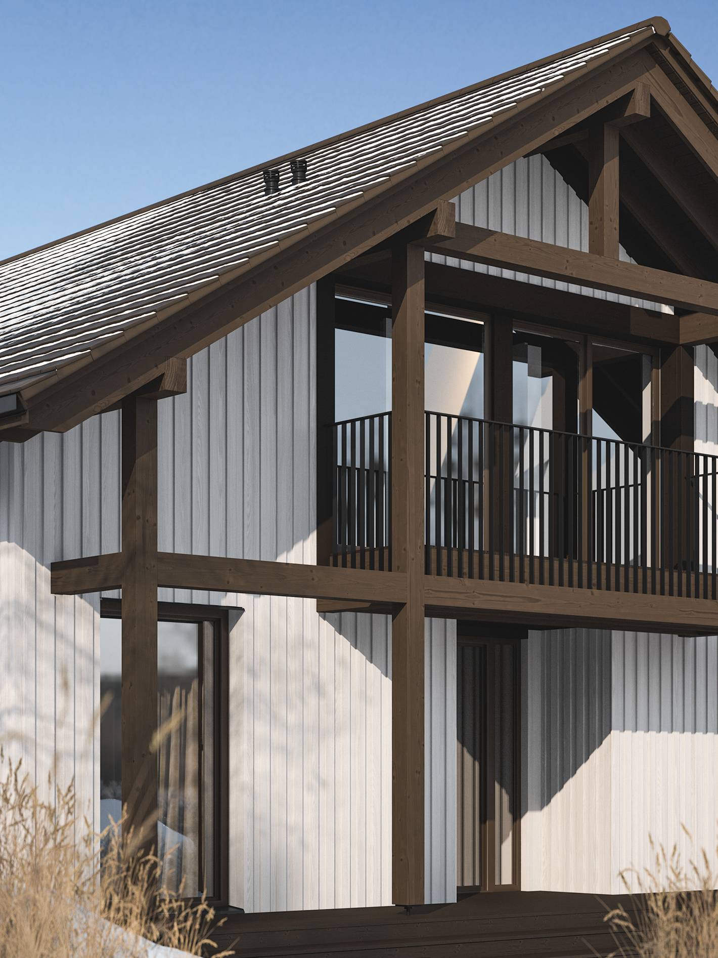 The two-story family house, GROW 2, stands out as a spacious and visually distinctive project within the Dores house collection. The well-thought-out and highly practical layout, featuring four separate rooms, a spacious living area, and several utility spaces, is well-suited for comfortable family living, working from home, and hosting guests.