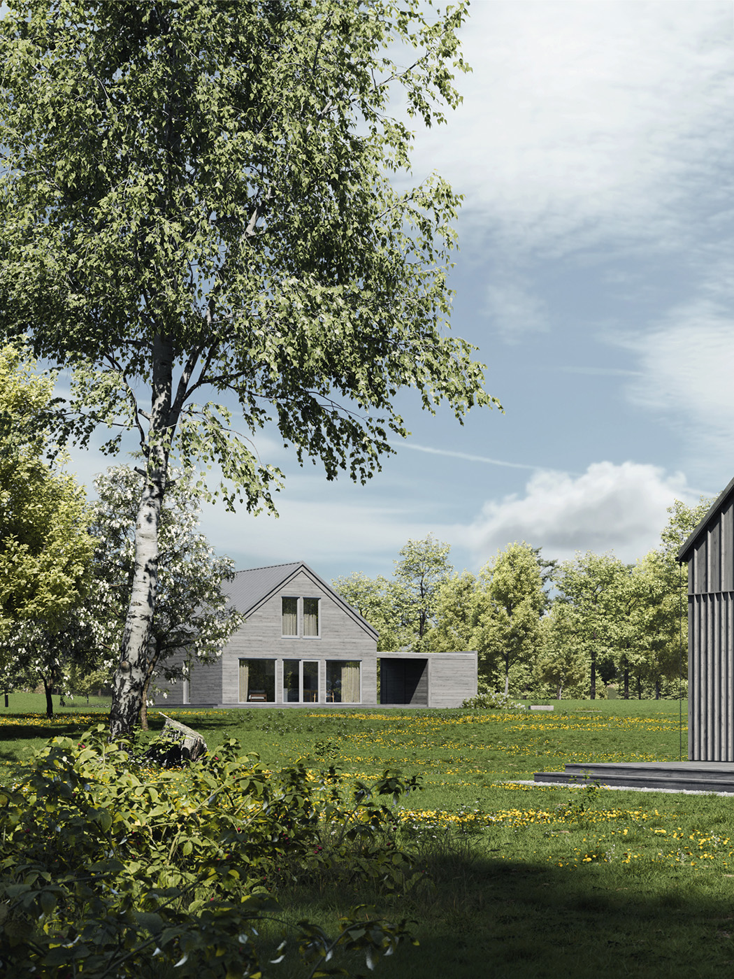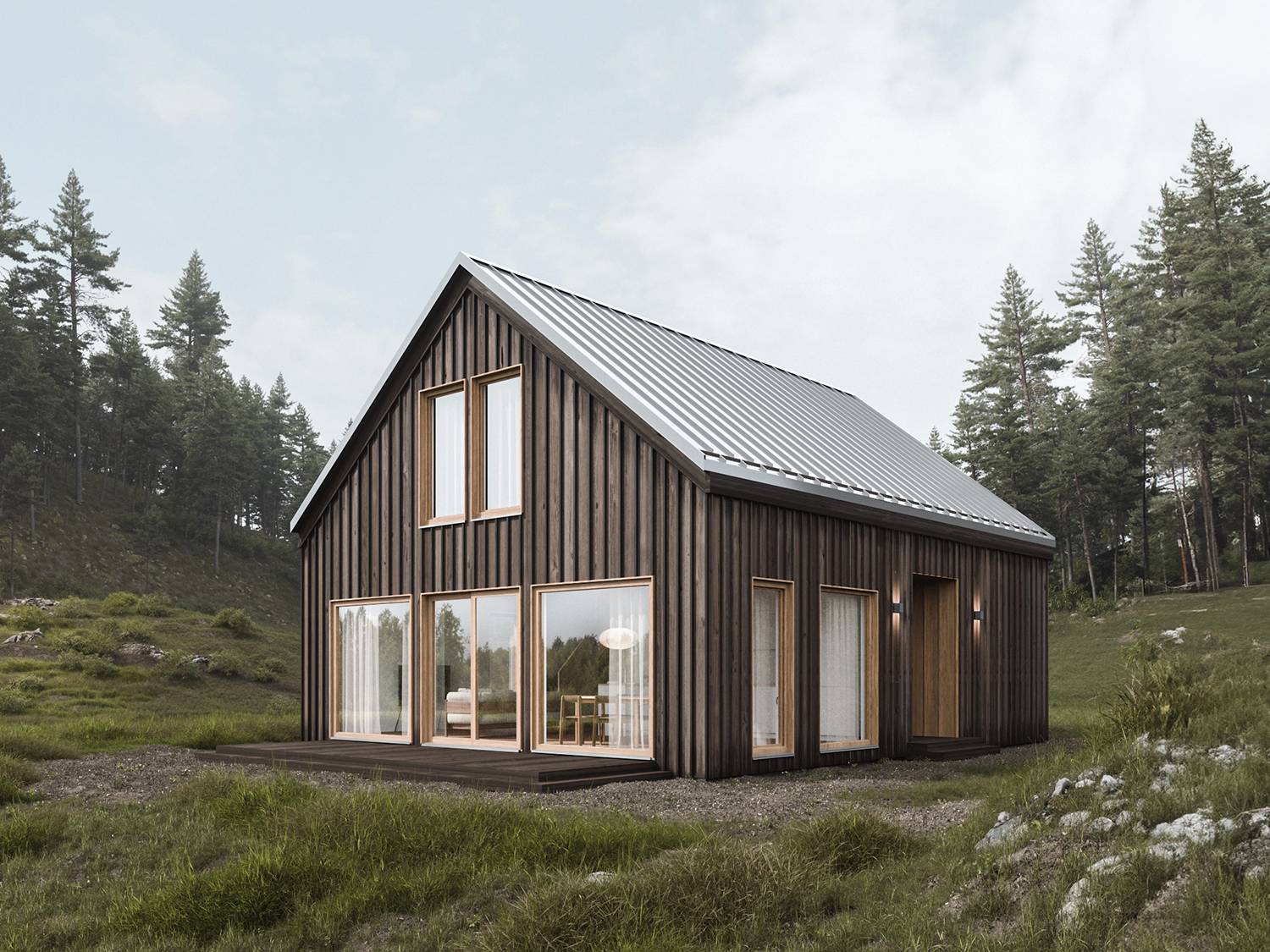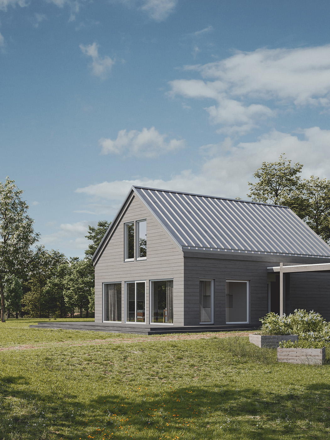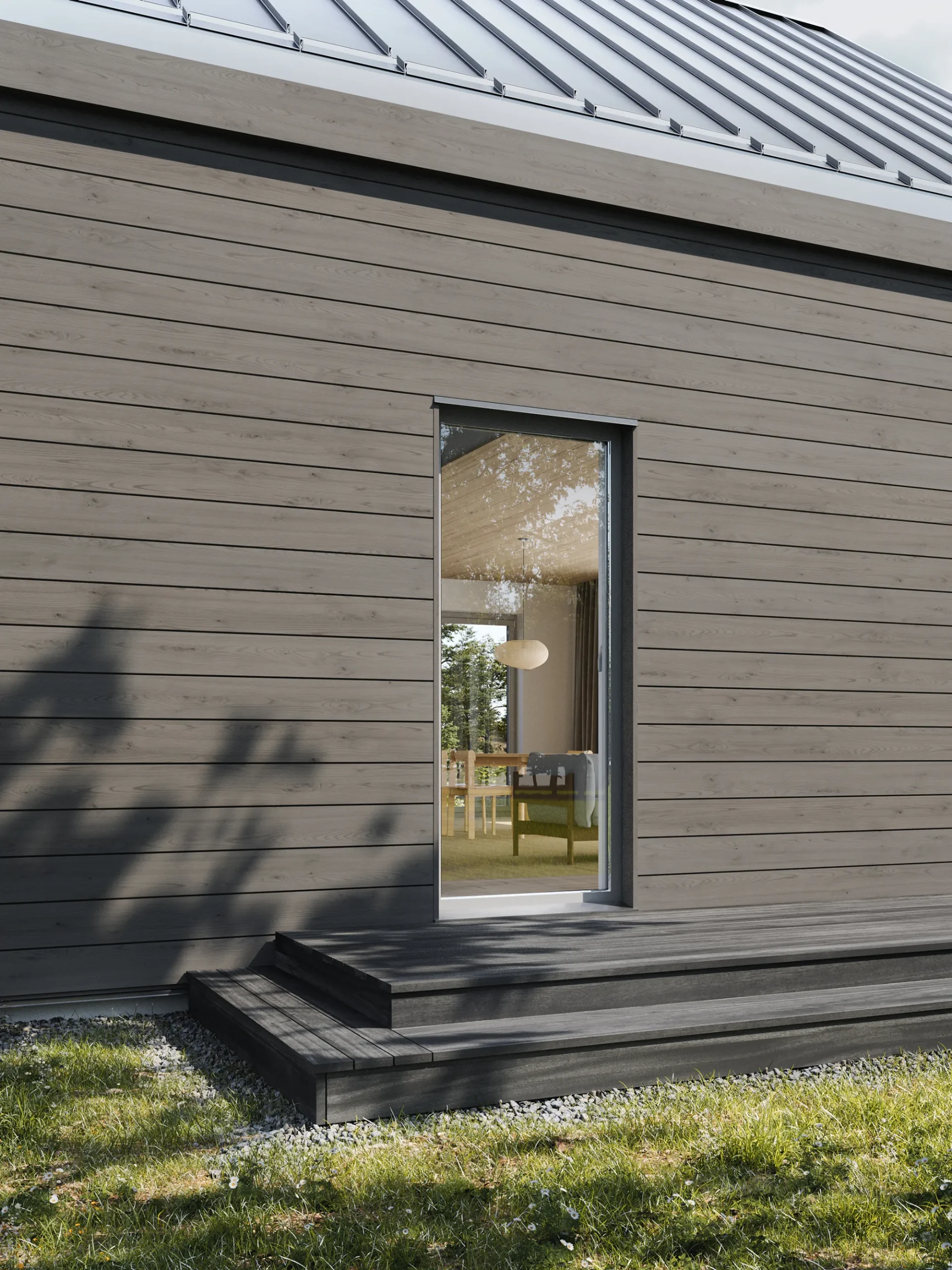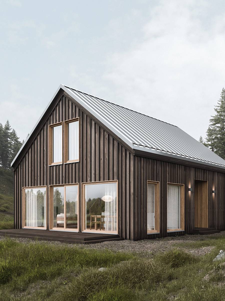 The two visual variations of the SETTLE 2 home showcase different cladding options for its timber frame construction. The exterior undergoes a notable transformation simply by opting for vertical cladding instead of horizontal, along with adjustments to the shade.