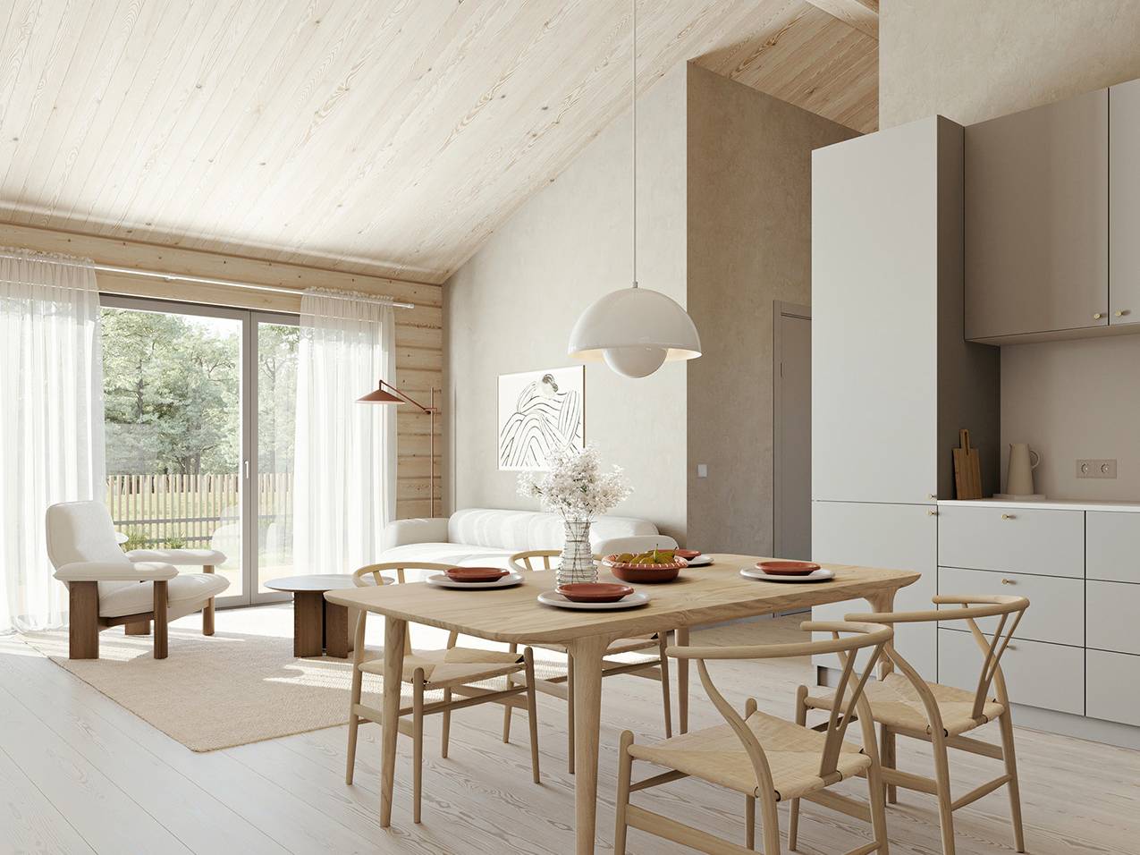 Constructed with logs, the house exudes a natural charm, inviting you to immerse yourself in nature even if you are located in a town or urban setting. However, it can also be crafted with the modern Zen corner or in timber framing instead of glulam log.