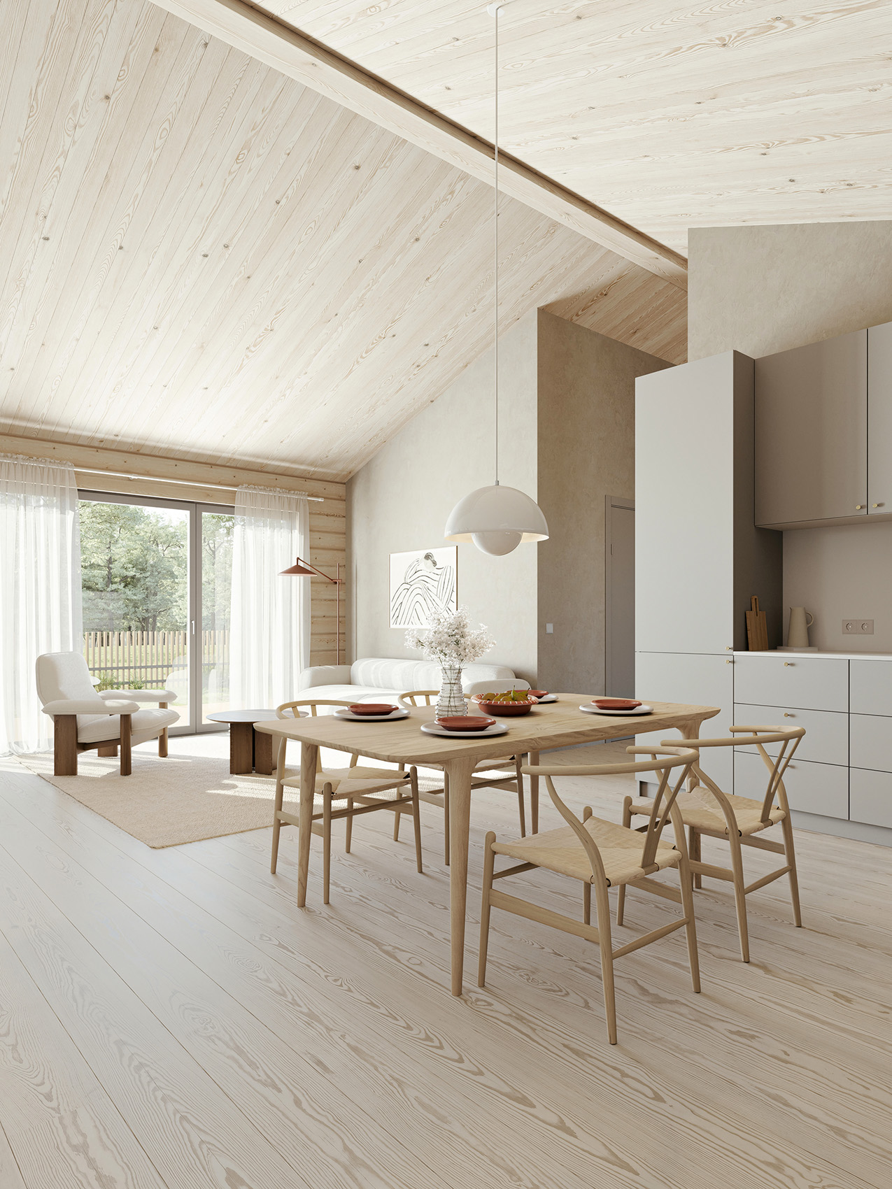 Constructed with modern glulam logs, the space is filled with the warmth and coziness of natural wood, both inside and out. Meanwhile, timber framing offers the flexibility to substitute interior walls with alternative materials, enabling a personalized touch based on your preference.