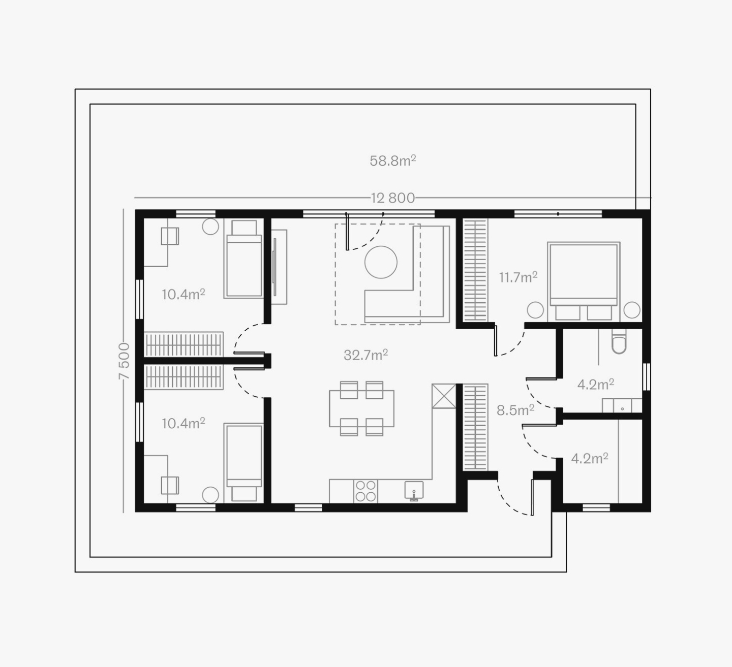 The beloved SETTLE 1 project now offers a compact version, SETTLE MINI, where a functional, comfortable, and fully-equipped family home is planned within just 82 square meters. We've designed this home to be compact and budget-friendly while still including a spacious terrace that serves as a comfortable and easily livable extension during the warmer months.